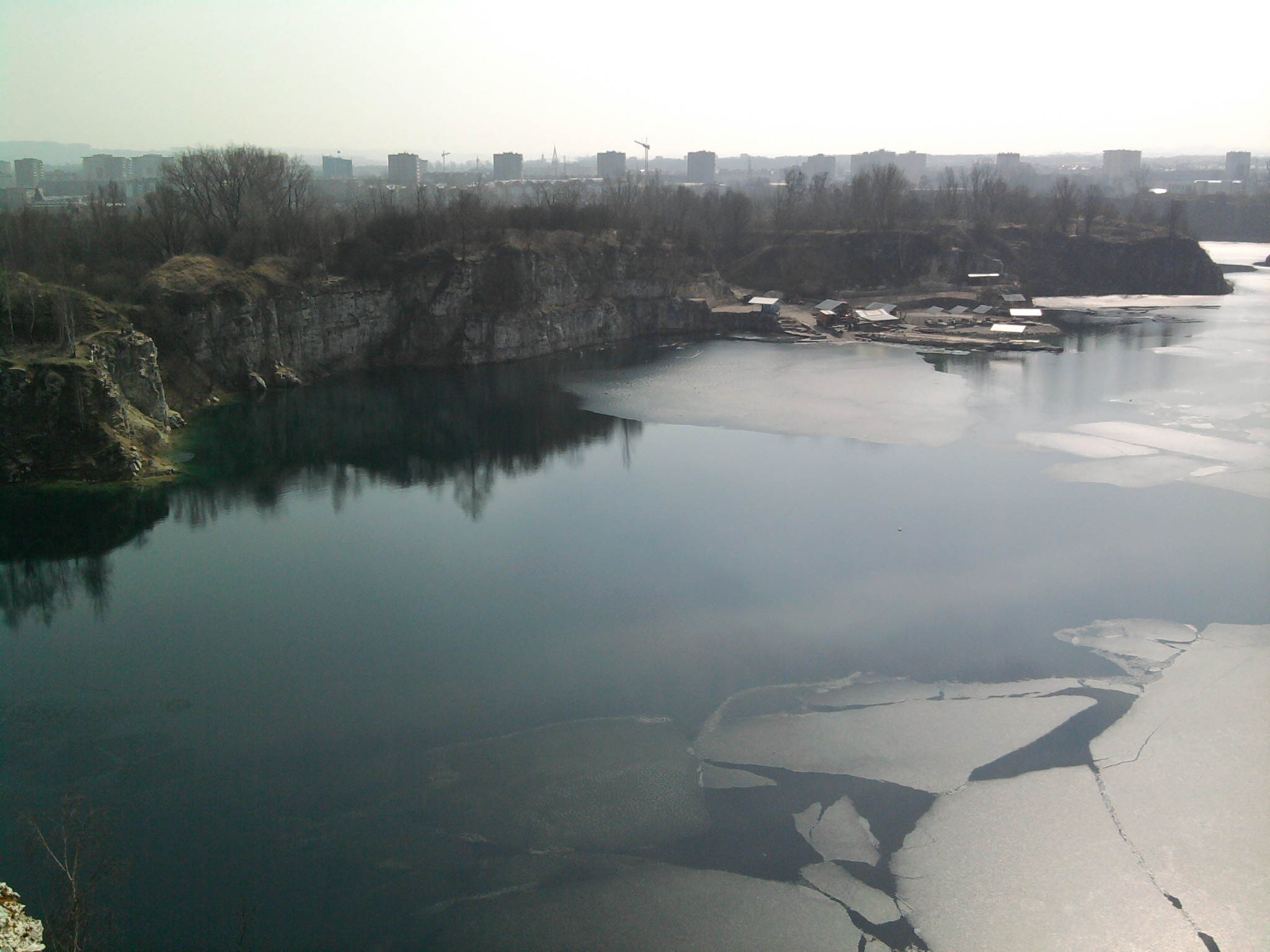 w każdym razie do konkretów: przy drabince po prawej lód wytopiony na tyle, że da się spokojnie wejść, ale tylko tam. stare przeręble np. nad platformą są pokryte na tyle grubym lodem że można spokojnie po nim chodzić - zrobiłam spacer do połowy akwenu po lodzie, więc.. możliwe że jeszcze trochę ten lód wytrzyma.