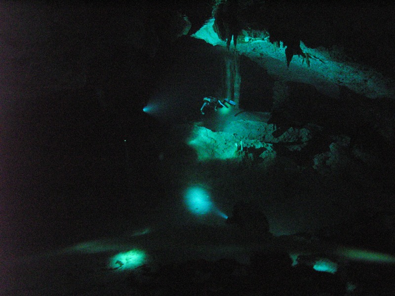 Rano zabierają nas z hotelu i wiozą do takiego wyschniętego lasu nazywanego tutaj dżunglą. Rośnie to na skale jak na Zakrzówku a woda pod spodem wypłukała labirynt jaskiń. Co parę kilometrów lub set metrów "sufity" się pozapadały i można wejść. Nurkujemy w zakresie 100-200 metrów od wejść, co tu się określa jako cavern chociaż trochę to daleko. Przewodnik na cztery osoby. To nie jest po prostu płyniecie tam i z powrotem tylko raczej zataczanie łuków przez kolejne wymycia. Najpiękniej jest jak się wraca i widać niebieskie światło wejścia.